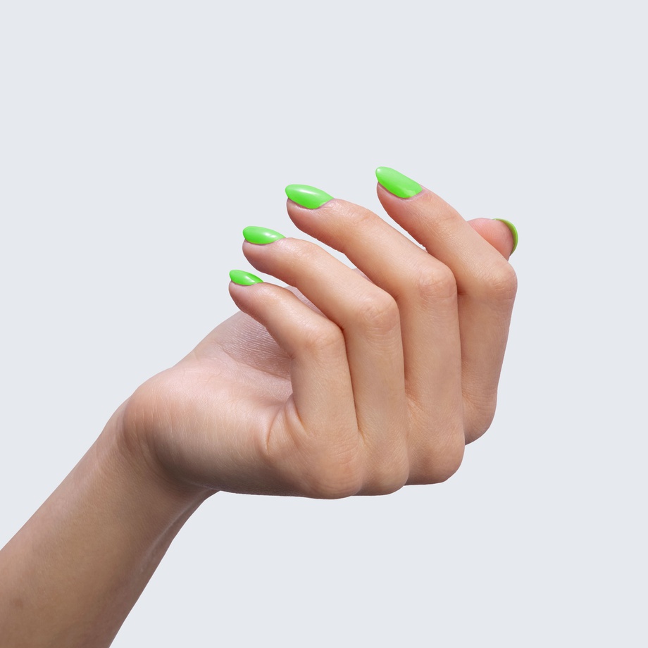 Neon green. Bright. Cool undertone. Medium opacity (slightly translucent).
